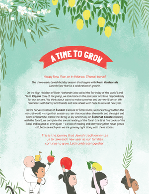 Designed to meet the needs and interests of a wide range of families, A Time to Grow serves as your family’s road map to the first holidays of the Jewish year, from Rosh Hashanah (Jewish New Year) and Yom Kippur (Day of Forgiving) to Sukkot (Festival of Small Huts) and Simchat Torah (Rejoicing with the Torah).